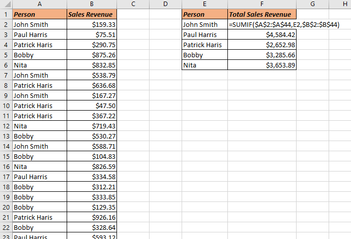 In first example I will show you how you can use SUMIF Formula in excel. I will use a for data base with sales and person revenues I will make total of each person in a report table so making first total of john smith I will put